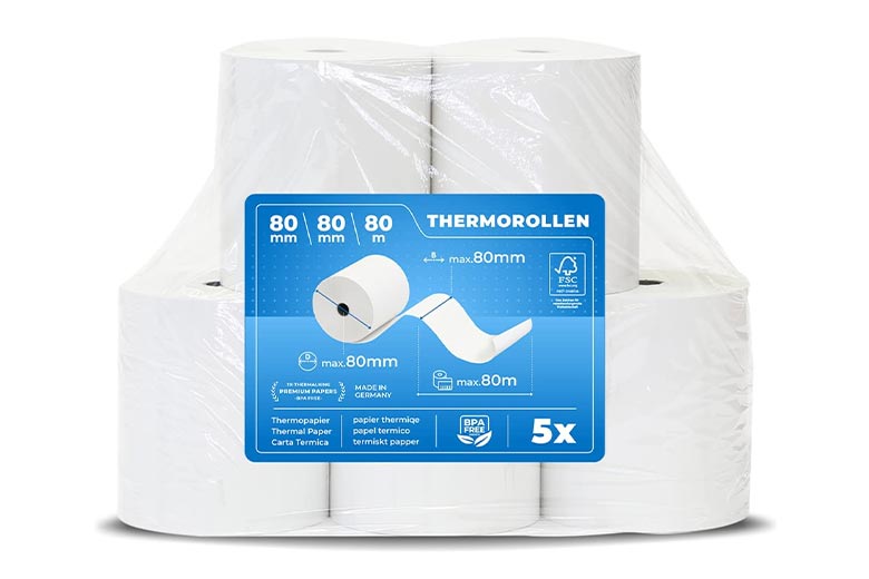 - Papierbreite: 79,5 mm, max. Durchmesser: 83 mm